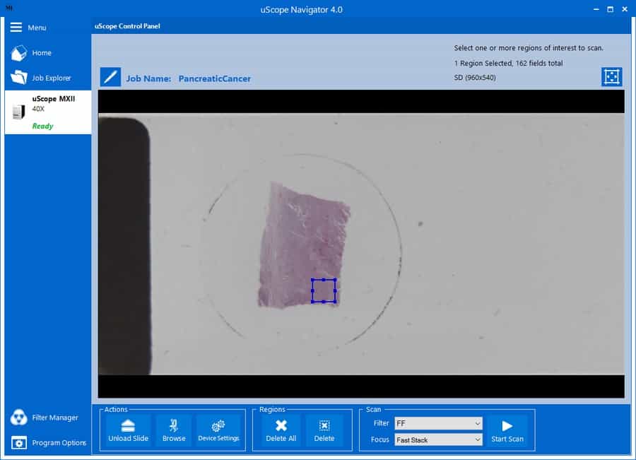 The uScope Navigator can scan a region of interest on your prepared slide. It does this by capturing multiple fields, one at a time, by moving the objective across a rectangular region of interest. Each field is saved in the folder of your choice as a standard JPEG image file. The uScope Navigator application can optionally combine the fields into a full-sized deep zoom image that you can view using a standard web browser.